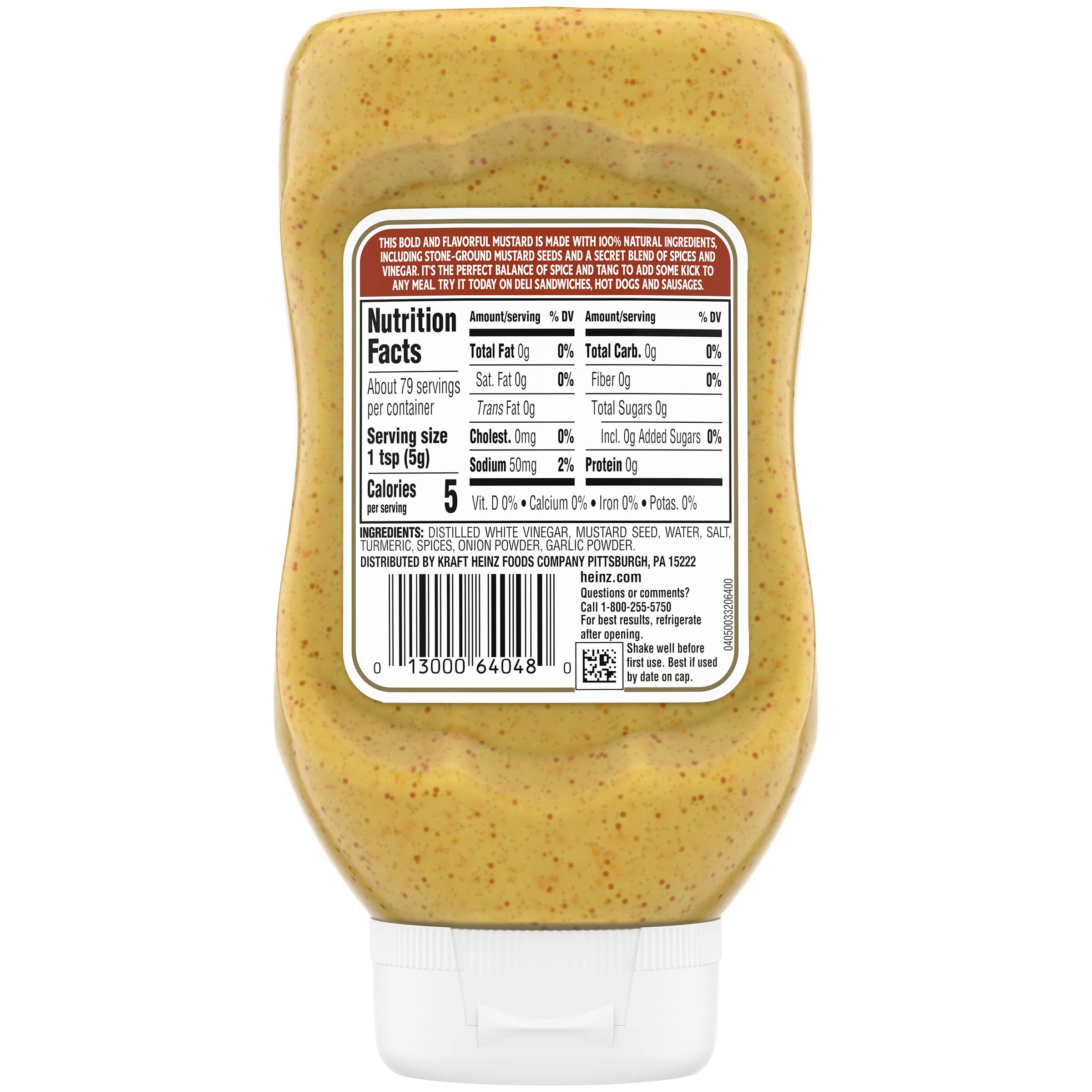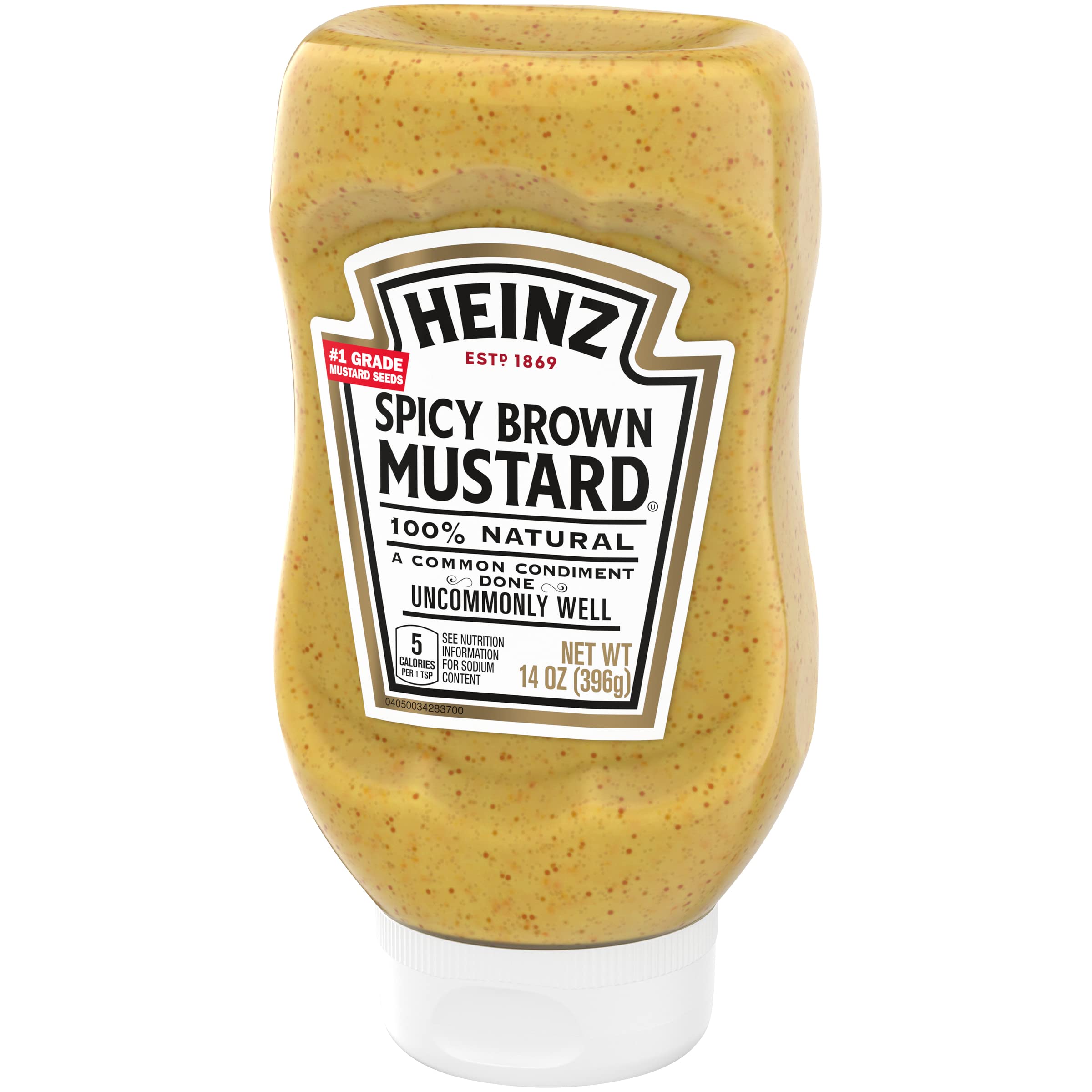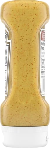 Details: Heinz Spicy Brown Mustard offers the trusted, flavorful taste of classic Heinz Mustard with the perfect amount of spiciness that complements a wide range of foods. Try this deli mustard on a burger, hot dog or sub sandwich. Made with great ingredients including stone-ground mustard seeds and a secret blend of spices and vinegar, this delicious grain mustard delivers a bold, spicy taste. This delicious brown mustard will elevate any dish you add it to, and the 14 ounce upside-down squeeze bottle is easy to use. Whatever the occasion, Heinz Spicy Brown Mustard is something the whole family will love.