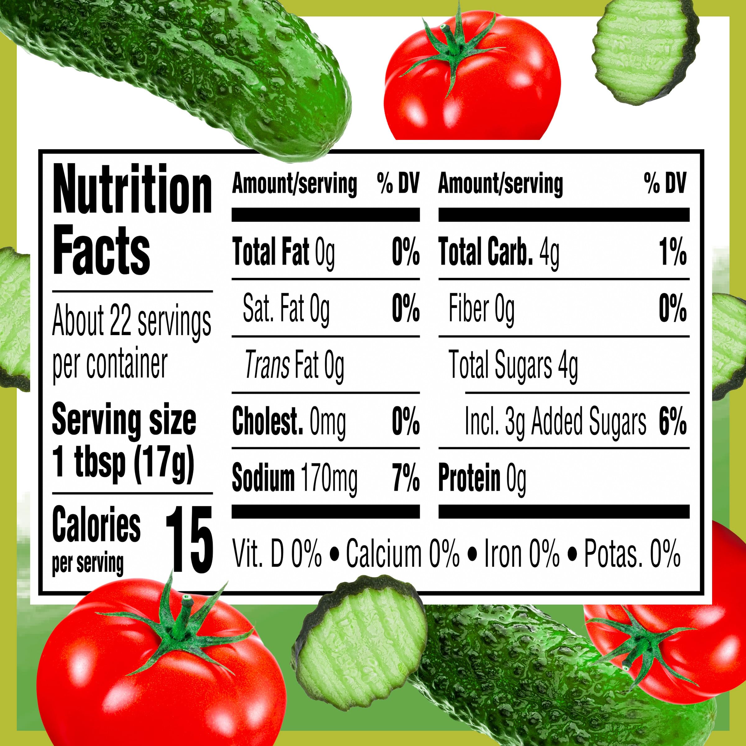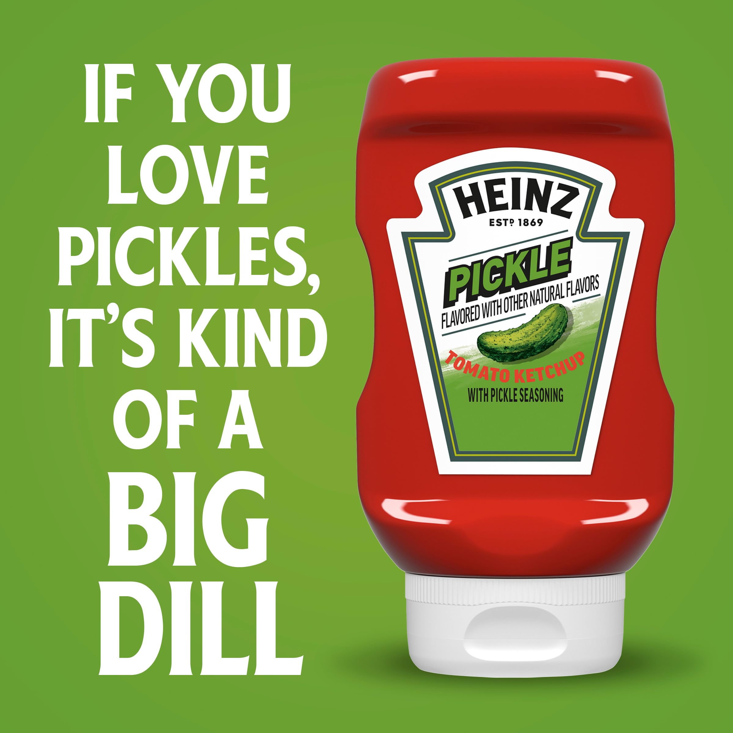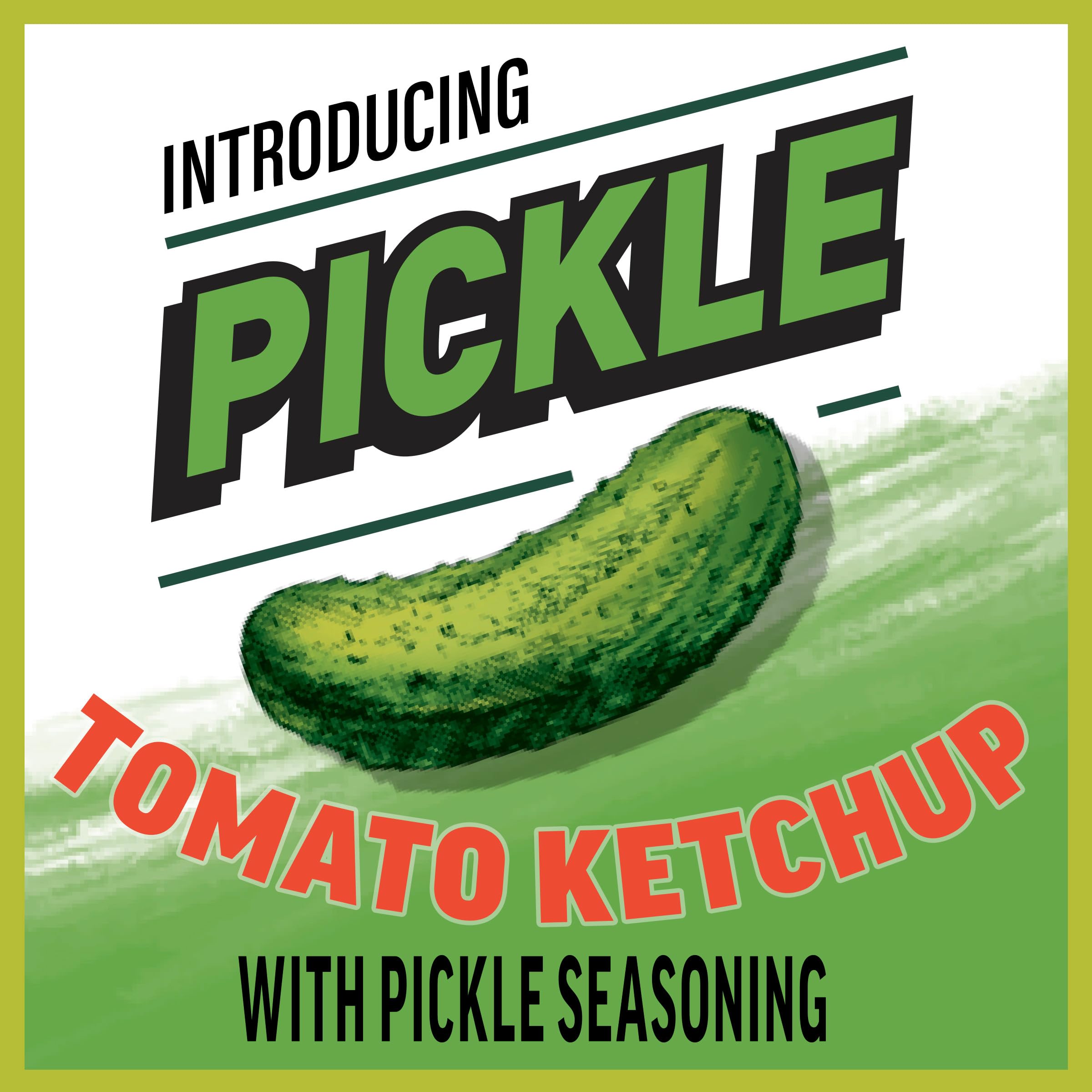Details: Pickle lovers, rejoice! The thick and rich Heinz Ketchup you love now packs a punch of pickle flavor. Add a bold, tangy twist to all your favorite foods with Heinz Tomato Ketchup with Pickle Seasoning. Our tomato ketchup with pickle seasoning features notes of brined cucumber juice, vinegar and dill for a bright, fresh flavor. The bright pop of vinegar and the freshness of blended cucumber juice complement ketchup’s sweet flavor, making it a versatile option for providing a fresh tang that pairs perfectly with grilling favorites. Try our tomato ketchup with pickle seasoning on burgers, hot dogs, chicken, fries and more. Our tomato ketchup with pickle seasoning comes in an easy-to-squeeze bottle that makes serving clean and simple. Each 13.5-ounce bottle contains about 22 servings. Heinz Tomato Ketchup with Pickle Seasoning is kind of a big dill, so if you love pickles, try our unique condiment with your next meal.