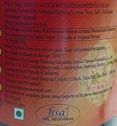 - Ingredients: Soybean, Chilli, Canola Oil, Salt, Sugar, Monosodium Glutamate, Sulfur Dixide, Sodium Sulfate.