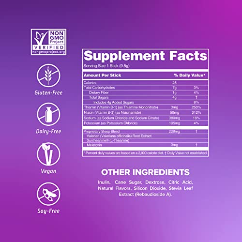 - EXTRAORDINARY HYDRATION: Hydration Multiplier +Sleep contains L-Theanine, Valerian Root extract, and 3mg of clinically tested melatonin per stick.^ Gluten-free, soy-free, and dairy-free.