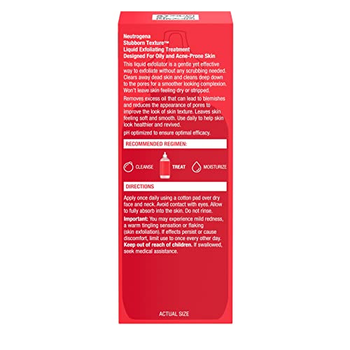 Details: Get a healthier looking complexion with Neutrogena Stubborn Texture Liquid Exfoliating Treatment with dermatologist recommended ingredients including 7% AHA blend & Pro-Vitamin B5. Designed for oily, acne-prone skin, this facial exfoliator from a dermatologist-recommended brand removes dead skin & excess oil that can lead to blemishes. This liquid exfoliant is a gentle yet effective way to exfoliate without any scrubbing & won’t leave your skin feeling dry or stripped. It’s packed with a blend of glycolic & citric acids to help remove pore-clogging dirt & oil. Formulated with Pro-Vitamin B5 to help nourish skin, it improves texture after just one week. pH-optimized for optimal efficacy, the formula is fragrance-, paraben-, phthalate-, alcohol- & oil-free & is not tested on animals. Apply once daily using a cotton pad over dry face & neck, avoiding contact with eyes. Allow the exfoliant to fully absorb into skin & do not rinse. 3 out of 4 consumers saw smoother looking skin after one week.