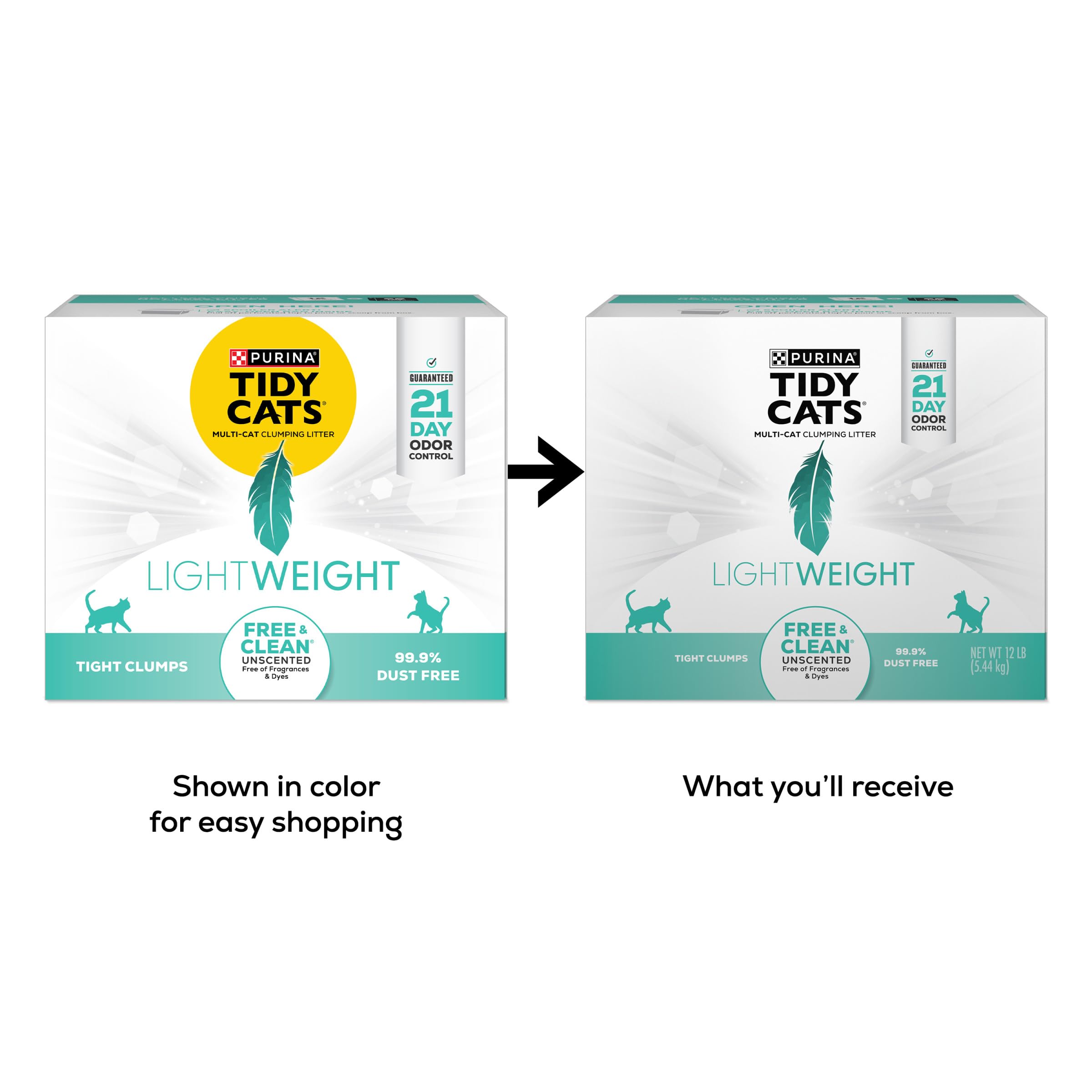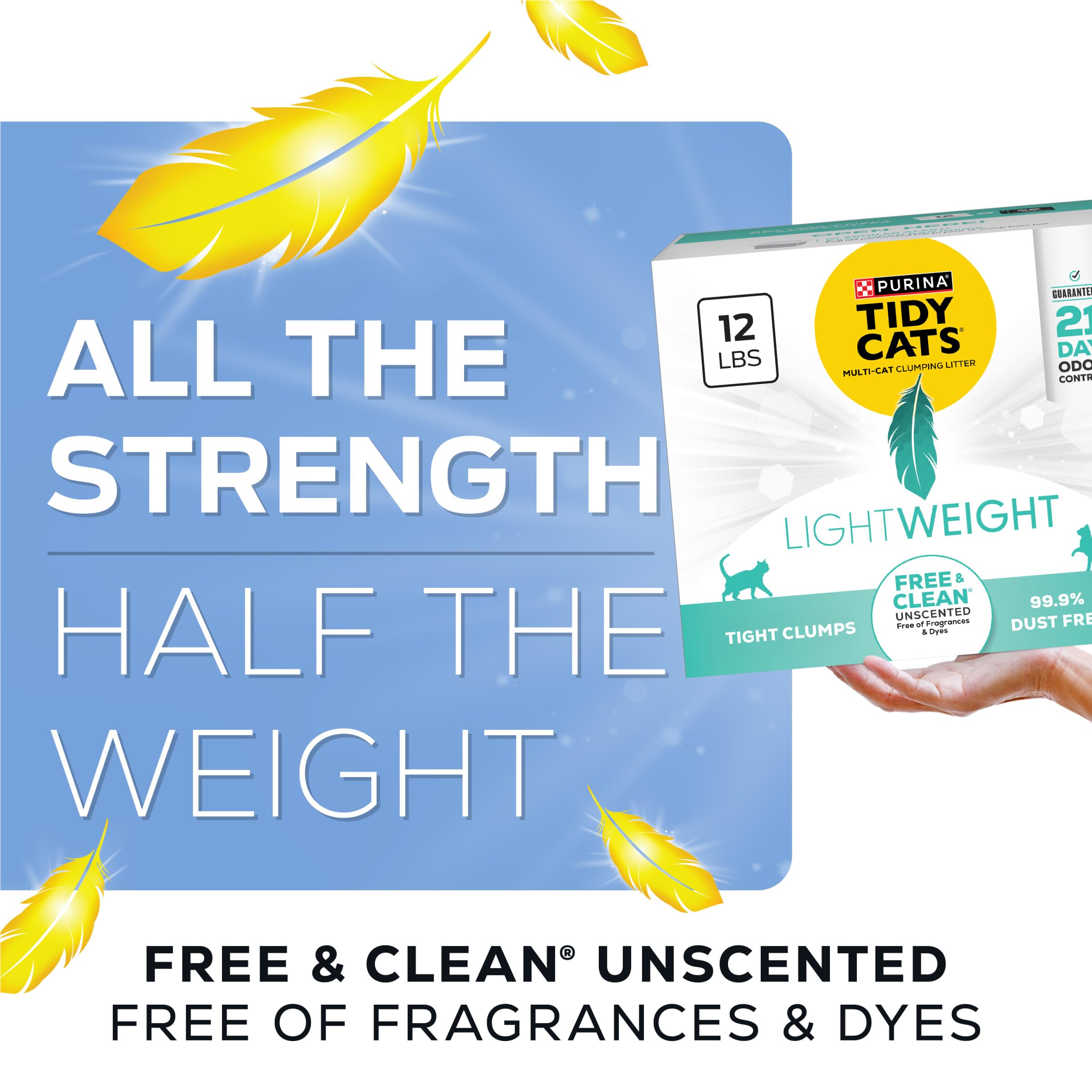 Details: Conquer litter box maintenance without the pain of litterback with Purina Tidy Cats LightWeight Free and Clean Unscented Cat Litter. This multi cat litter prevents ammonia odor for 21 days (when used as directed) while remaining free from dyes and fragrances—perfect for sensitive noses. Tidy Cats unscented litter is easy to carry, weighing half as much as the leading clumping cat litter while providing the same amount of litter. The low dust cat litter is easy to use and is 99.9 percent dust free and forms strong, tight clumps for quick and easy scooping and effortless litterbox maintenance. A good option for multi cat families, put this powerfully absorbent Tidy Cats litter into every cat litter box and make each one a welcoming place for your cats. Add Purina Tidy Cats LightWeight Free and Clean Clumping cat litter odor control to your cat’s litter box for the great formula you love and the performance and odor control you expect at a fraction of the weight.