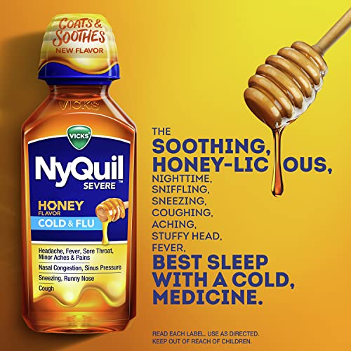 Details: Knock your cold out with Vicks DayQuil and NyQuil SEVERE Honey Flavor Cold & Flu Liquid medicine. Just one dose starts working fast to relieve 9 of your worst cold and flu symptoms, to help take you from 9 to none. Flavored with real honey, Vicks DayQuil and NyQuil SEVERE Honey formulas provide fast, powerful, maximum strength relief for your worst cold and flu symptoms, day and night. Try Vicks DayQuil SEVERE Honey for fast, non-drowsy daytime relief and use Vicks NyQuil SEVERE Honey when you need maximum strength, nighttime relief for your ugliest, roughest, toughest cold symptoms so you can get the rest you need. Vicks DayQuil SEVERE provides 9-symptom relief to treat coughing, stuffy nose, minor aches, chest congestion, sinus congestion, sinus pressure, sore throat, headache, and fever. Vicks NyQuil SEVERE provides 9-symptom relief to treat coughing, stuffy nose, minor aches, sneezing, sinus congestion, sinus pressure, sore throat, headache, and fever. Vicks has been trusted for over 125 years to relieve your cold and flu symptoms. When you need powerful cold and flu relief, DayQuil and NyQuil are the #1 pharmacist recommended daytime and nighttime cough, cold & flu brands* *2022 Pharmacy Times Survey of Pharmacist OTC Recommendations