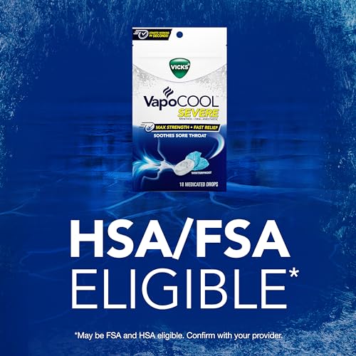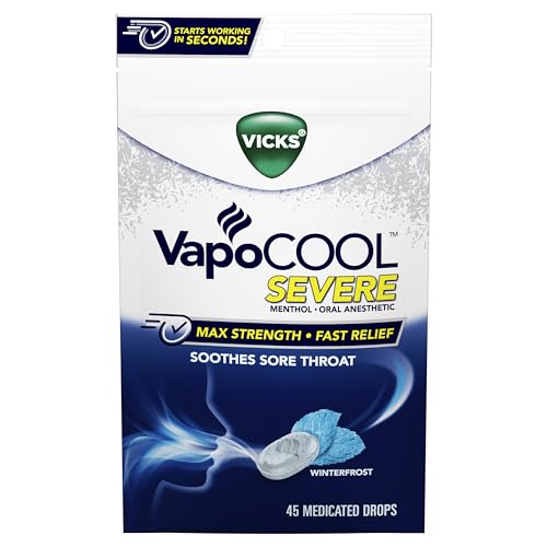Details: Vicks VapoCOOL SEVERE Winterfrost Medicated Drops start working in seconds to deliver a powerful rush of Vicks Vapors and soothe your worst sore throat pain. From the makers of Vicks, the world’s #1 selling cough, cold, and flu brand. For over 85 years, Vicks has been a trusted choice for drops to tackle sore throats. Each drop will start working in seconds to deliver powerful, fast sore throat relief. Specially formulated with menthol, a powerful oral anesthetic, you can vaporize your sore throat pain. For maximum strength relief, Vicks VapoCOOL SEVERE combines the winterfrost flavor with the effectiveness of a max strength sore throat drop. It’s not candy, it’s powerful relief. To use, dissolve one drop slowly in the mouth. Repeat every 2 hours as needed or as directed by a doctor. VapoCOOL SEVERE Drops are intended for use by adults and children 12 years of age or older. Should not be used by children under 12 years of age. Vicks has your sore throat covered! Also try Vicks VapoCOOL Sore Throat Spray – available in Winterfrost flavor.